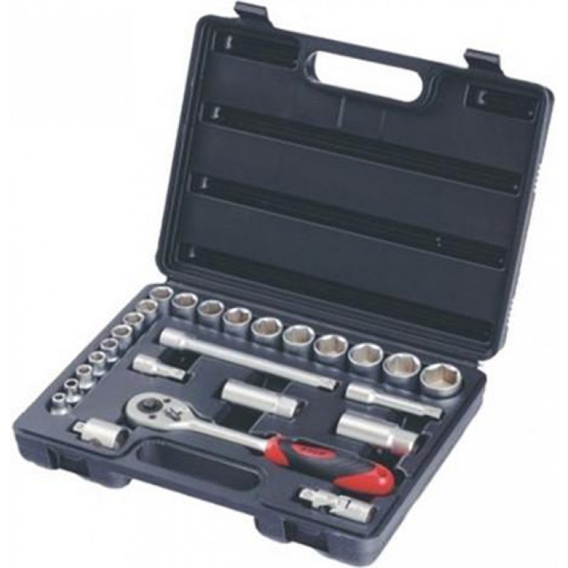 В набор инструментов входит трещотка с двумя вариантами фиксации, что позволяет как откручивать, так закручивать крепеж. Сама трещотка изготовлена из стали, а ее рукоятка – из пластика с резиновыми вставками, облегчающими работу с ней. Для удобства работы в труднодоступных местах имеются три удлинителя для трещотки, длиной до 15 см и переходник, который фиксируется под углом 45 градусов в обоих направлениях. Для работы с шестигранными болтами и гайками Park NABIN12 26 укомплектован 18-ю головками размером от 6 до 24 мм, а для того чтобы можно было пользоваться головками с разным размером посадочного места, имеется переходник для трещотки и удлинителей. Приятным сюрпризом для владельцев автомобилей и автомехаником являются два свечных ключа разного размера, которые подходят под любой из трех удлинителей.