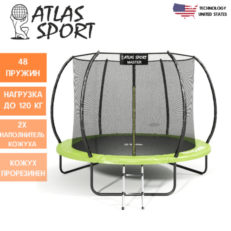 - Высокая защитная сетка – также важное условие для безопасности батута. Сеть Atlas Sport выполнена из высококачественного нейлона, в меру эластична и обладает амортизирующими свойствами.