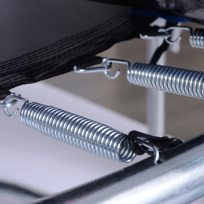 - Пружины батута Atlas Sport, которых в данной модификации – 48 штук, имеют особую форму для правильного распределения нагрузки на металл при растяжении. Пружины присоединяются к полотну при помощи треугольных карабинов на петле, каждая из которых прострочена 8-ю плотными фабричными швами, что полностью защищает от разрывов в местах крепления пружин. Плотное защитное покрытие толщиной 12мм и шириной 36 см полностью закрывает пружины и каркас рамы батута, тем самым исключая падение ног в эту часть и последующих за этим травм.