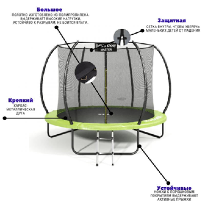 Оцинкованные пружины в батуте покрыты двухслойным материалом. Он заполнен губкой, которая обеспечивает эффективную защиту от снега, дождя, непогоды.