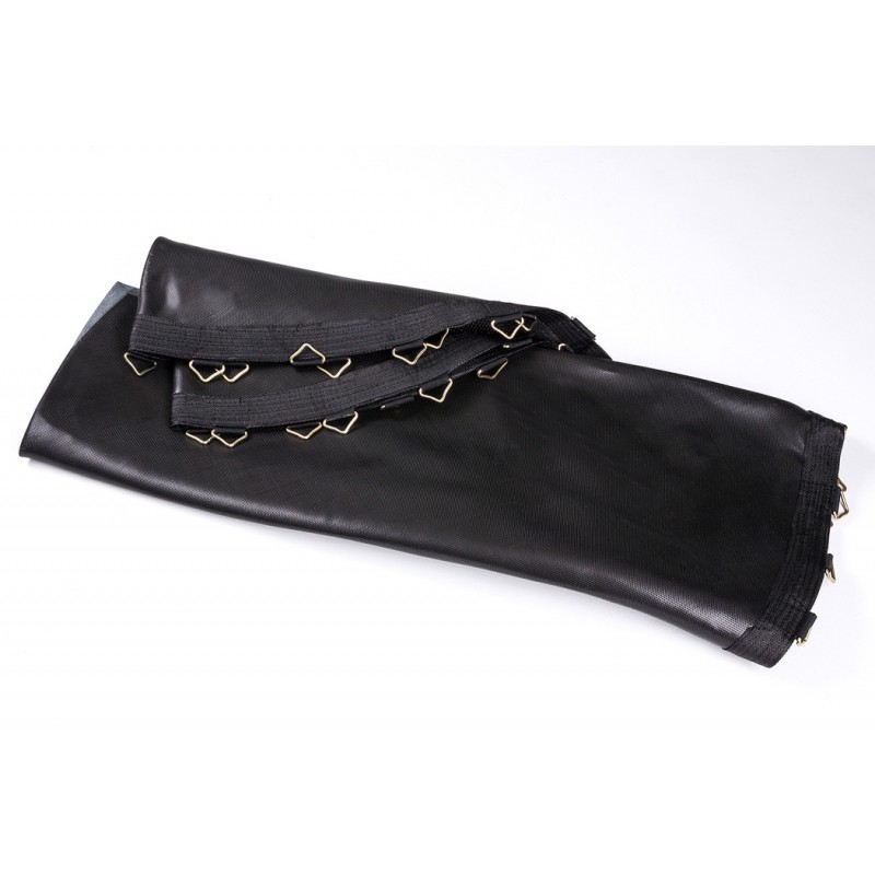 - Плотное защитное покрытие толщиной 24мм и шириной 36 см полностью закрывает пружины и каркас рамы батута, тем самым исключая падение ног в эту часть и последующих за этим травм. Прыжковое полотно произведено в США и изготовлено из прочного и упругого полипропилена. Выдерживает высокие и длительные нагрузки, устойчиво к влаге и механическим повреждениям. Также полотно имеет защиту от ультрафиолета, благодаря чему полотно не выгорает и греется намного меньше.