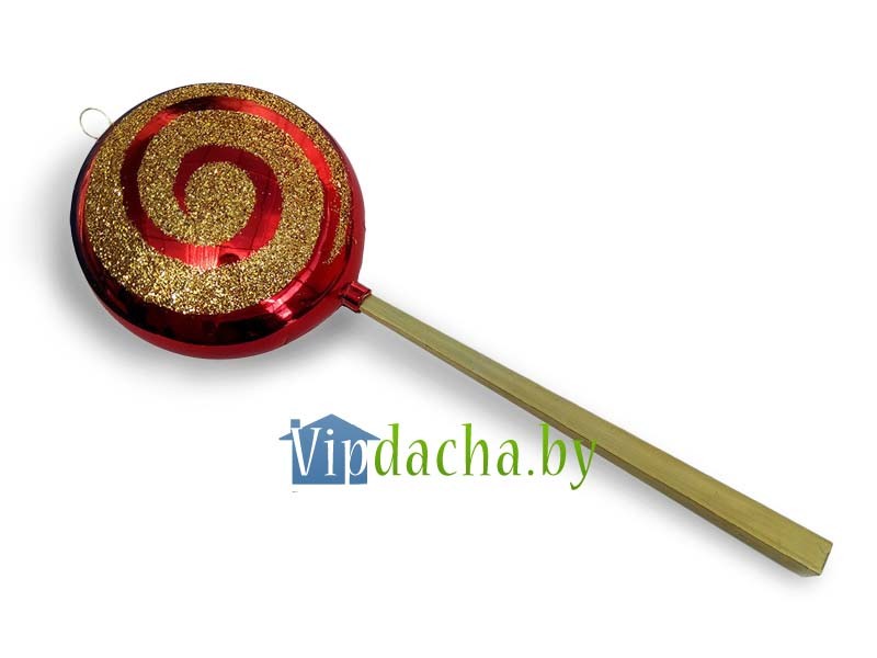 Новогодняя игрушка Леденец на палочке — красивая яркая игрушка алого цвета, на которую нанесен рисунок золотой объемной краской. Украшение имеет круглую форму, а в основании присутствует палочка — как у настоящего леденца.
