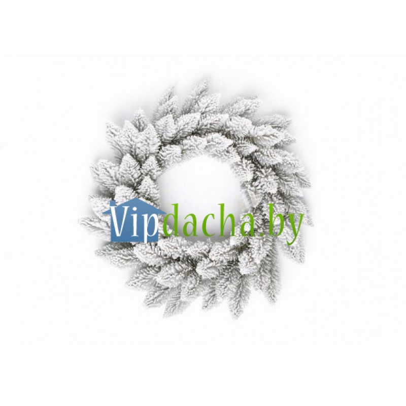 - Он сделан из зеленых хвойных веток, половина из которых припорошены искусственным снегом. Венок украшен шишками.