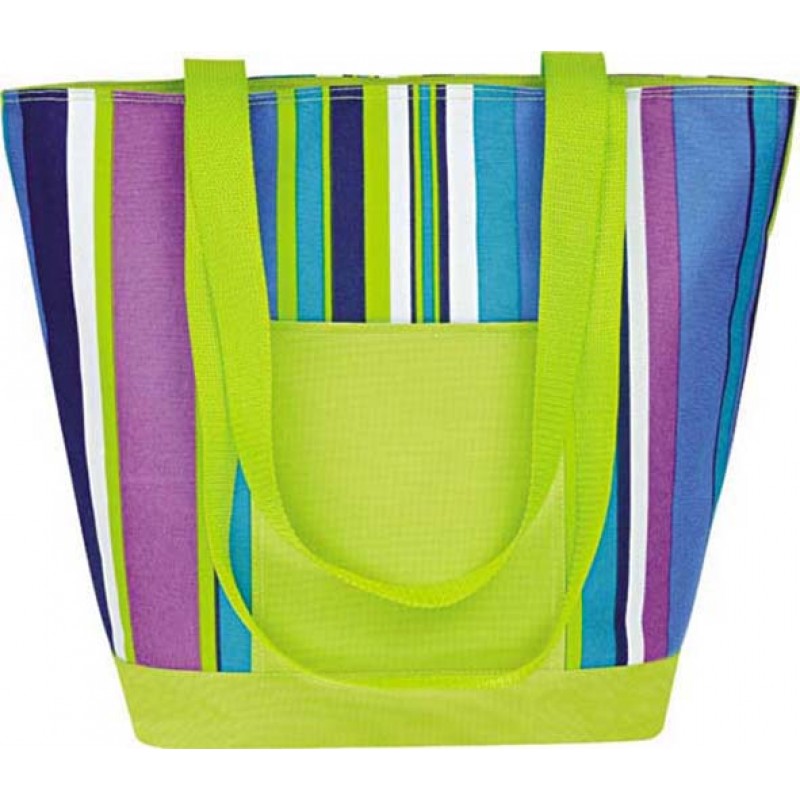 Имеет интересную конструкцию, чем-то напоминающую пляжную сумку. С такими же удобными для переноски ручкам(можно повесить на руку, либо закинуть на плечо). Сверху закрывается на удобный замок-молнию. Цвет изделия: салатовый с сочными, разноцветными полосками.
