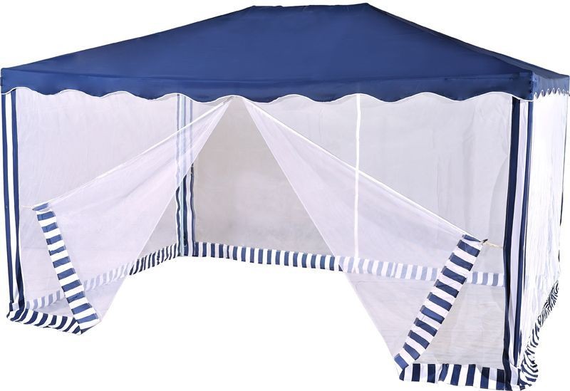 Шатер с сеткой наш интернет-магазин предлагает купить в синем цветовом исполнении: синей будет крыша и окантовка противомоскитной сетки внизу павильона.
