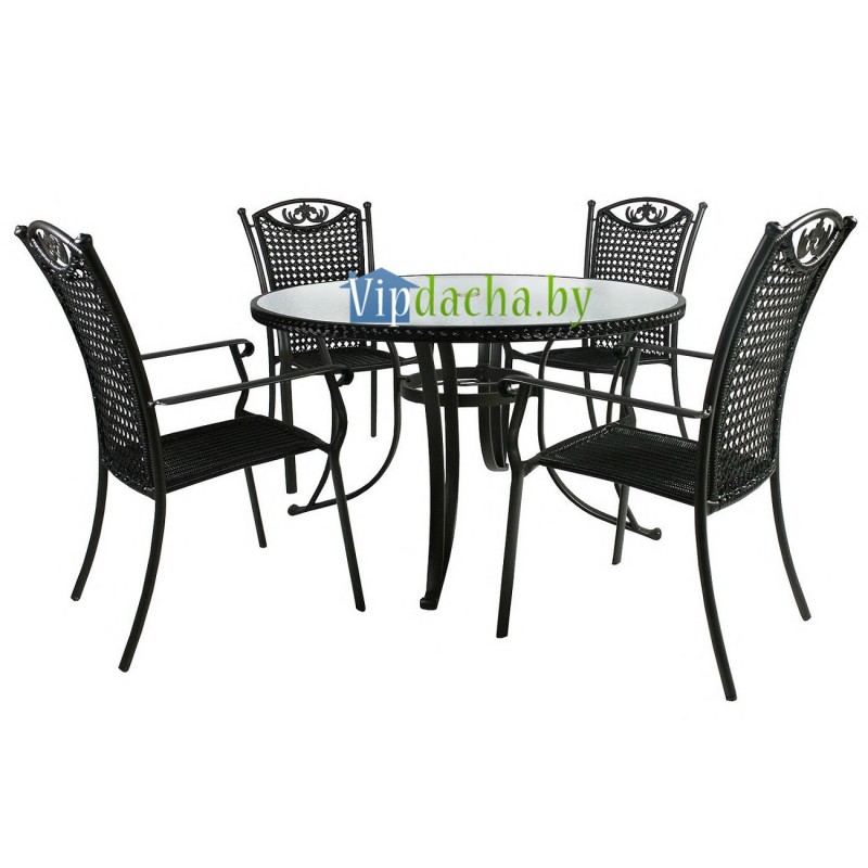 Стильный комплект мебели из 5 предметов: стола и 4 стульев. Каркасы стола и стульев изготовлены из алюминия, рабочая поверхность стола выполнена из стекла, сидения стульев - из плетеного пластика. Плетение из искусственного ротанга отличается повышенной прочностью и устойчивостью к атмосферным воздействиям, этот синтетический материал сохраняет своё качество при широком диапазоне температур окружающей среды. К тому же, искусственный ротанг не требователен в уходе, практичен в очистке, способен выдерживать большую нагрузку, а по своей фактуре и внешнему виду не отличим от натурального аналога.