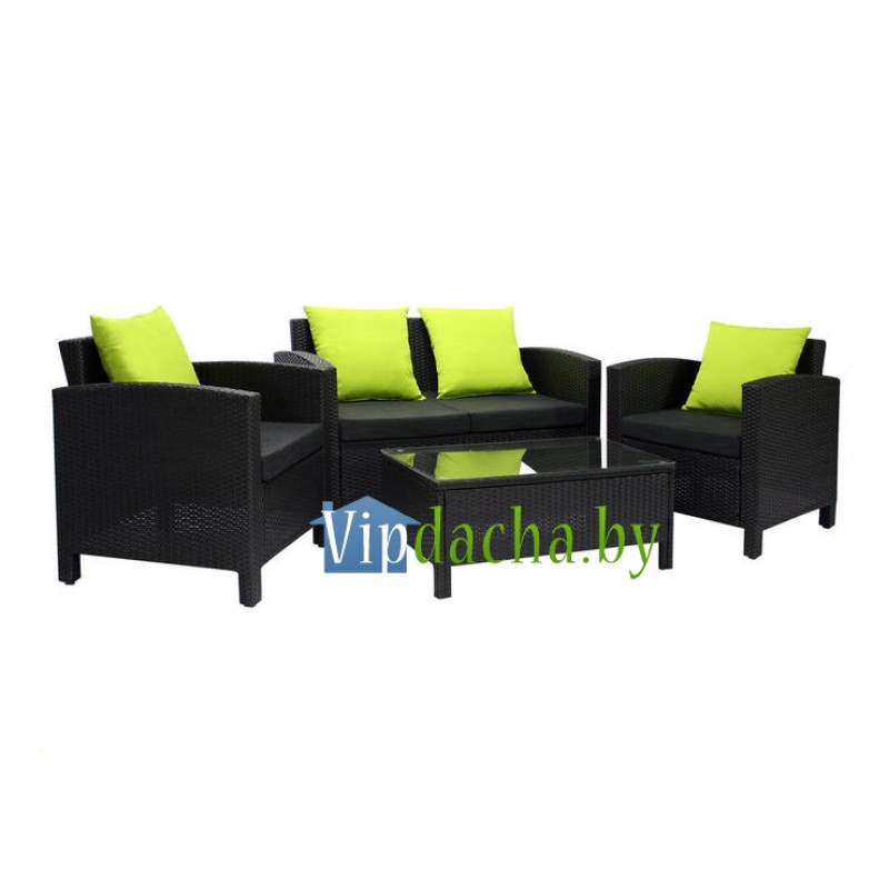 Комплект мебели SICILIA для комфортного и уютного отдыха состоит из двухместного дивана, небольшого столика со стеклянной столешницей, 2-x кресел и 4-x ярких подушек. Высокопрочный стальной каркас оплетен искусственным ротангом черного цвета. Такое сочетание материалов обеспечивает максимальную прочность и устойчивость конструкции мебели. К тому же, искусственный ротанг устойчив к воздействию влаги и солнца, что допускает возможность использовать комплект и на улице, например установив его на открытой террасе. Подушки яркого салатового цвета добавят ярких красок в интерьер дома или террасы.