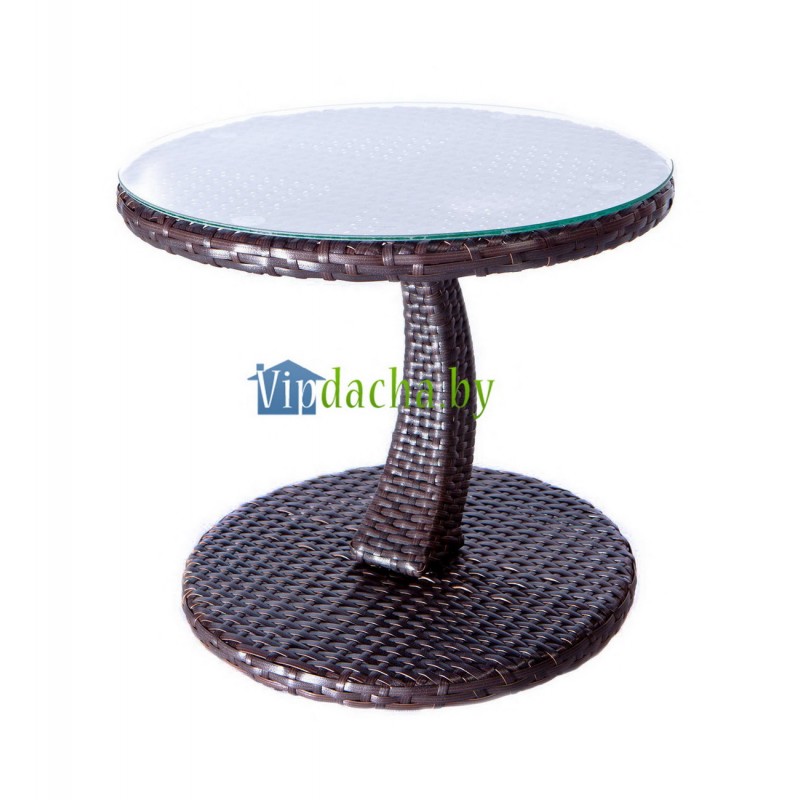 Темно-коричневый миниатюрный столик оригинального дизайна станет милым и практичным дополнением любой обстановки. Основа стола сделана из алюминия, оплетенного устойчивым к влаге и загрязнениям искусственным ротангом. Также имеется прочная столешница из закаленного стекла.