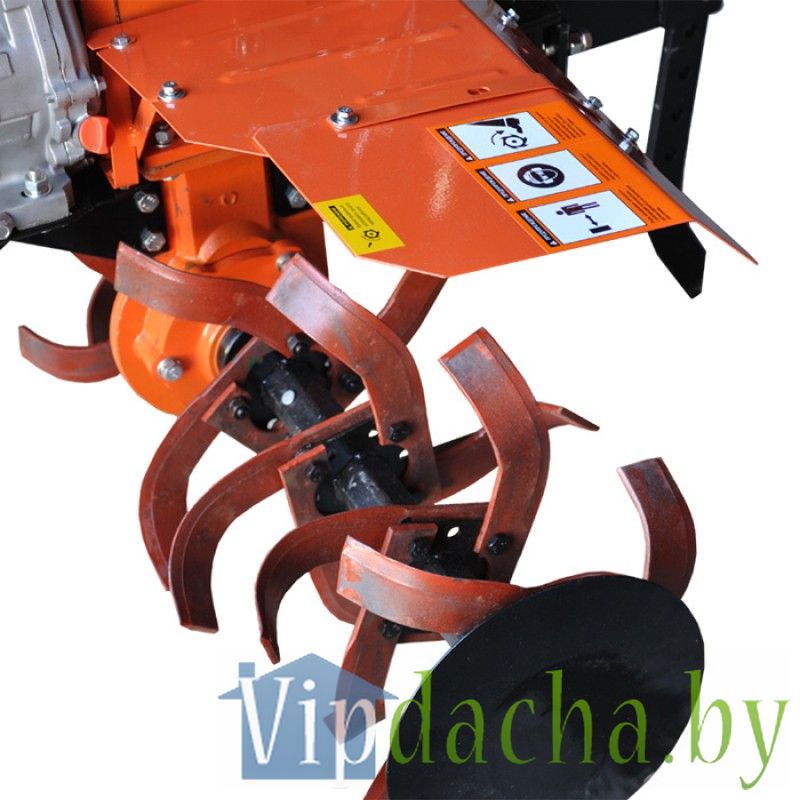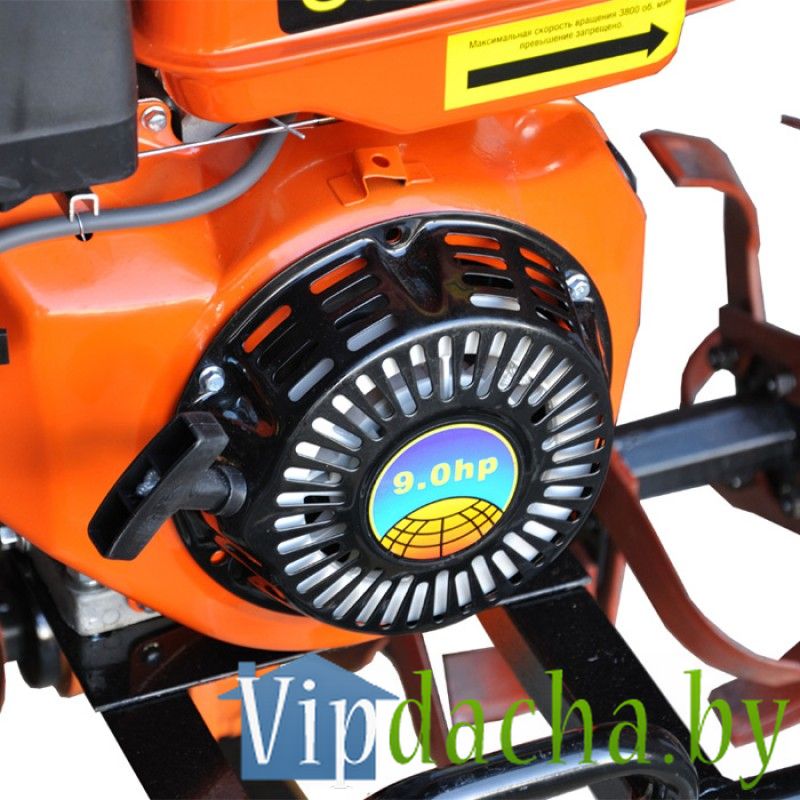 Мотокультиватор оборудован бензиновым двигателем 9.0 л.с., одноцилиндровый, четырехтактный, с воздушным охлаждением. Ручной запуск. Расход топлива: 1,6 л/ч. Скорость культивации: 6-12 м/мин. Радиус ножей: 160 мм. Количество ножей: 24 шт. Ширина обработки 850-1050 мм. Глубина обработки до 300 мм. Регулируемая по высоте ручка. Габариты: 1550х900х910 мм.