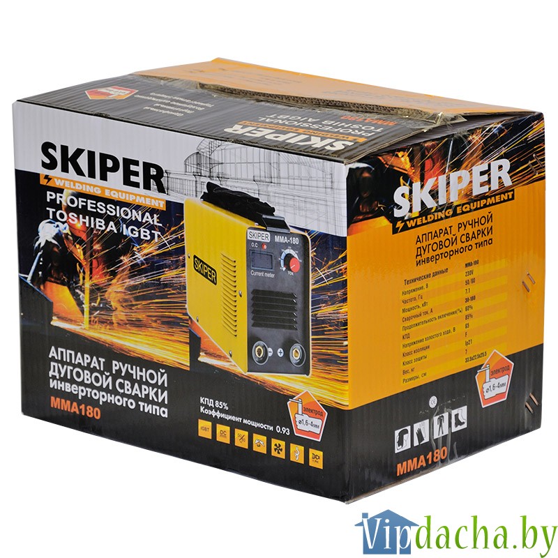 Skiper ММА 180i подходит для эксплуатации как в индивидуальном хозяйстве, так и для более профессиональной сварки в мастерских, на строительных площадках, предприятиях. Устойчив к перепаду напряжения сети. Оснащён стандартной вилкой с заземлением 16А/250В. Плавная регулировка сварочного тока от 30 до 180 А, цифровой индикатор, зажим массы и электрододержатель по 2 м каждый, щиток сварщика, русскоязычная инструкция и 24 месяца гарантии! В комплекте: двухметровый кабель - 2 шт., электрододержатель, зажим массы, щиток сварщика, щетка для чистки шлака.